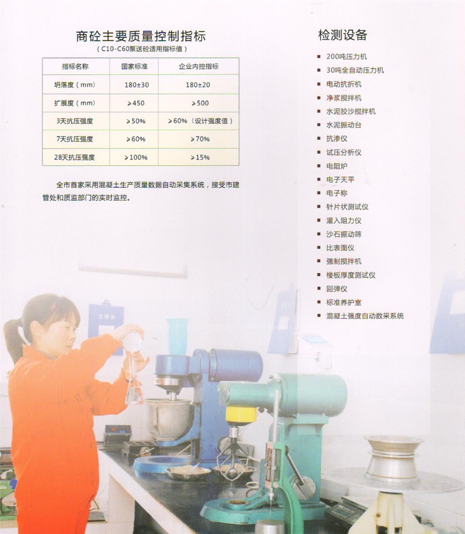 公司設(shè)有先進(jìn)的實(shí)驗(yàn)室,配備全套混凝土及原材料檢測試驗(yàn)設(shè)備,配有專職的試驗(yàn)、檢驗(yàn)人員,可承擔(dān)混凝土的材料性能試驗(yàn),工藝質(zhì)量控制、產(chǎn)品質(zhì)量檢驗(yàn)等全部試驗(yàn)、檢驗(yàn)項(xiàng)目,為確;炷临|(zhì)量提供了可靠的保證。